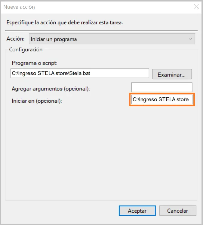 9. En el campo «Iniciar en (Opcional)», indicar la ruta de la carpeta donde se encuentra la automatización.