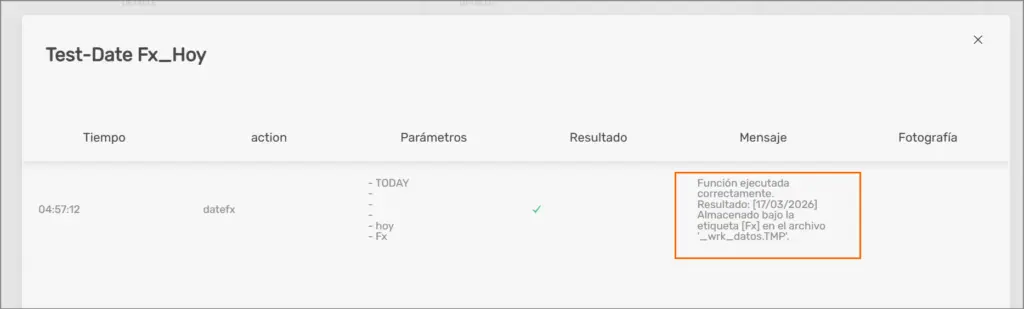 La función HOY del comando DateFx permite guardar el valor del día actual en una variable, en formato dd/mm/yyyy.