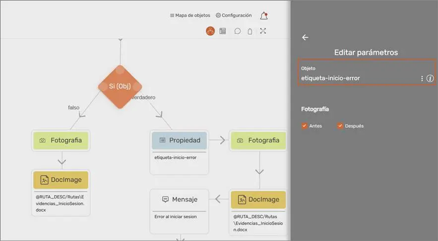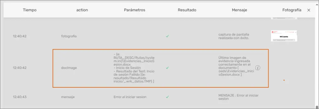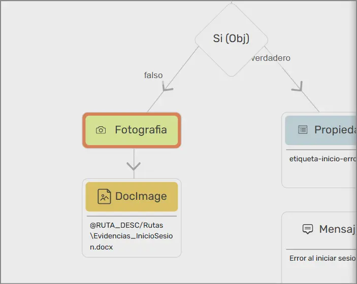 Se establece una condición que indica si el inicio de sesión fue fallido o fue exitoso. En este caso, si aparece un mensaje de error al dar clic en el botón Acceso, se indica resultado Fallido, de lo contrario se indicará resultado exitoso. En ambos casos, se guardará la imagen y la descripción en un documento.
