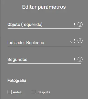 - Indicador booleano: Determina el comportamiento de la automatización. Generalmente, indica si el robot debe esperar a que el objeto aparezca en la pantalla (Verdadero) o si debe continuar la ejecución aunque el objeto no se encuentre (Falso).