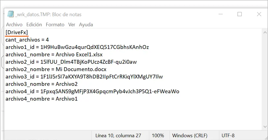 • Se observan los archivos listados, en el _wrk_datos de la automatización, bajo la etiqueta [DrivFx]. En el listado se detalla el fileID y el nombre de cada uno de los archivos encontrados en la carpeta: