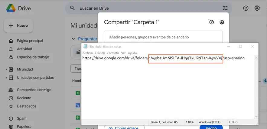 5. Pegar el enlace en un editor de texto para obtener el fileID, (texto) después de folder/ y hasta el signo de interrogación..